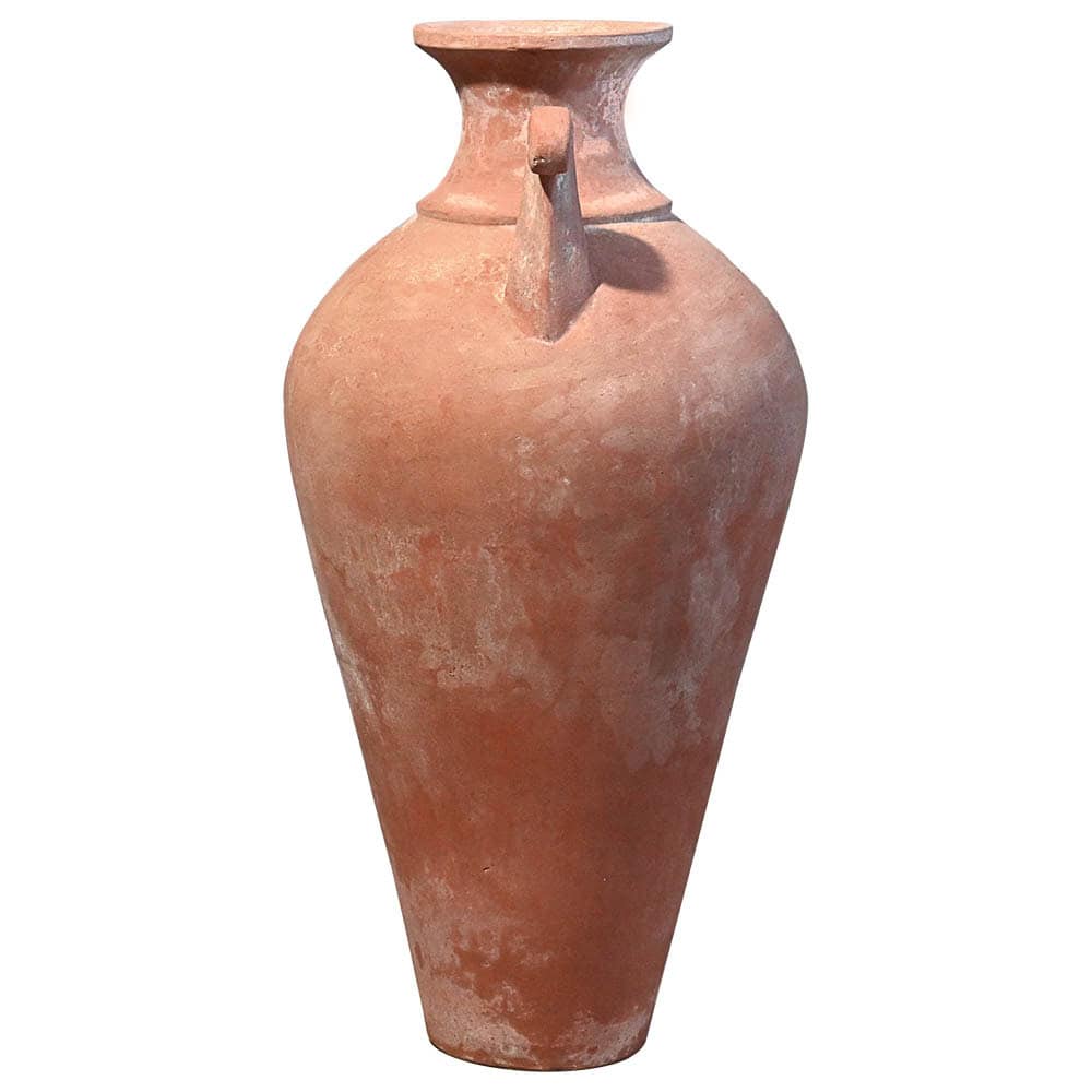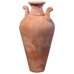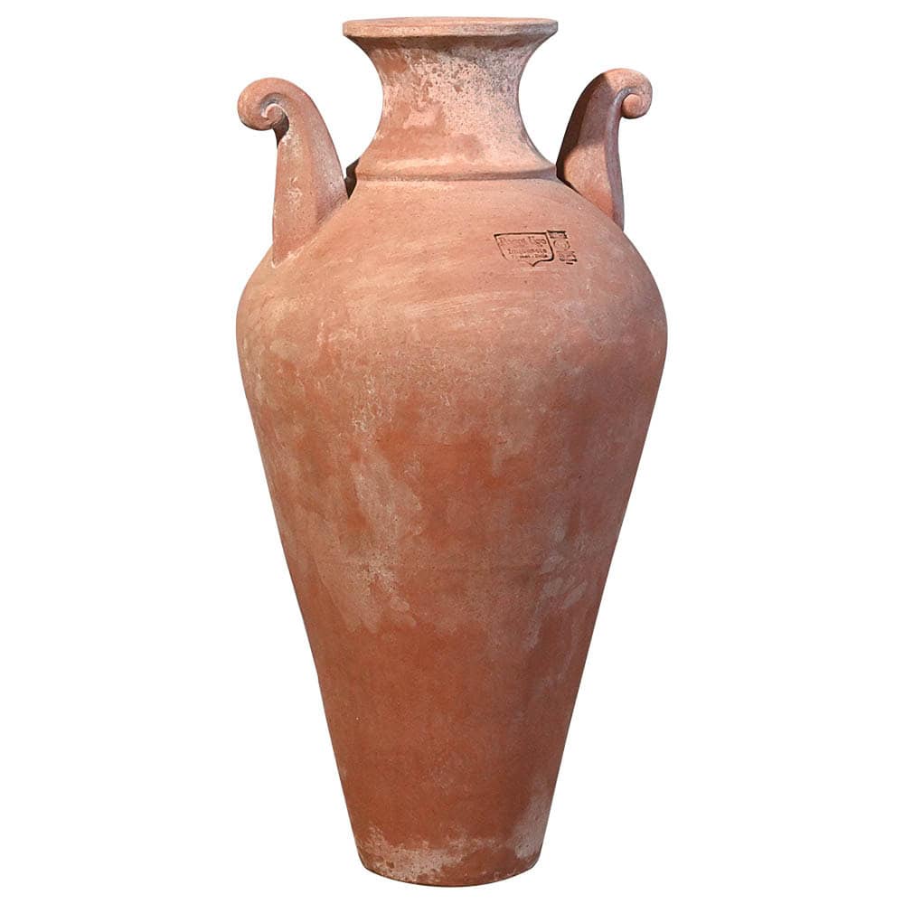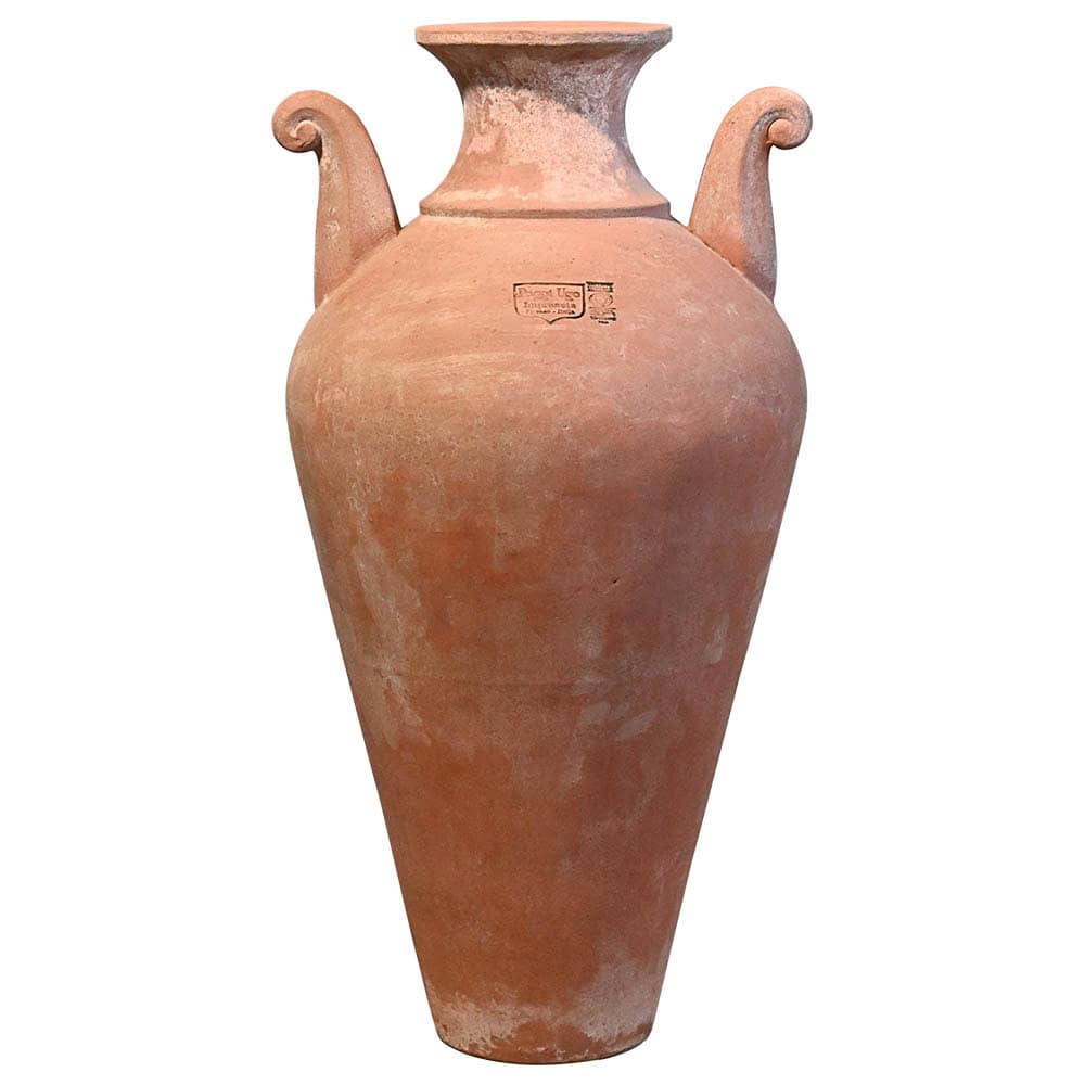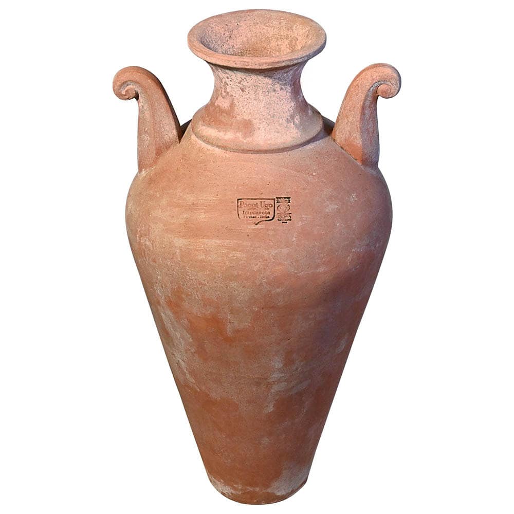 Furnishing item suitable in classic or historical environments. The elegant amphora with neck and two important curly handles measures about 90 cm in height. It is an exclusive model of the Poggi Ugo pottery from Impruneta, it is handmade by the skilled hands of craftsmen and it is an object that furnishes without necessarily being planted. The handles, for only decorative purpose, are the protagonists of this slim amphora. Over time, it acquires a beautiful surface appearance on which lichens and mosses can easily be deposited, creating different textures and designs.