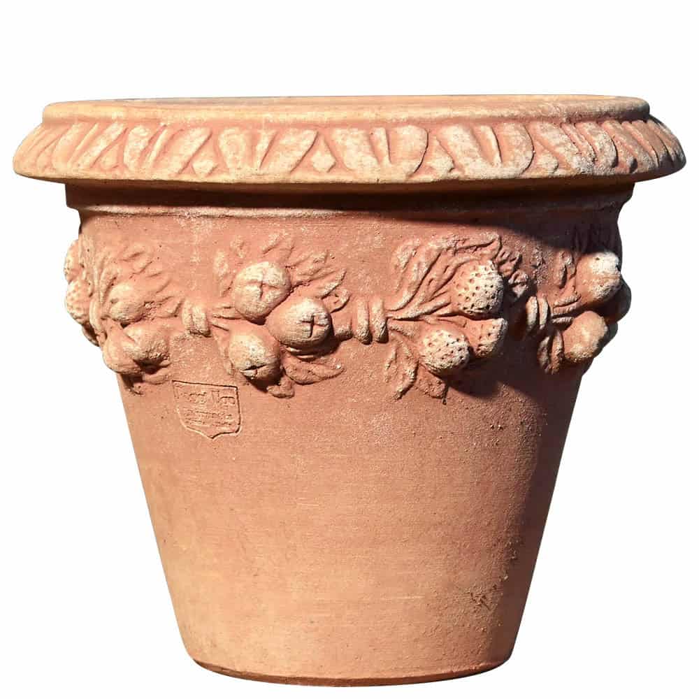 Plum-decorated small pot in Impruneta terracotta, handmade, compact size with a 19 cm diameter, perfect for aromatic plants, succulents, seasonal flowers, lemons, citrus, or small ornamental plants. Its truncated-conical shape ensures excellent soil capacity relative to its overall volume, promoting healthy root growth.