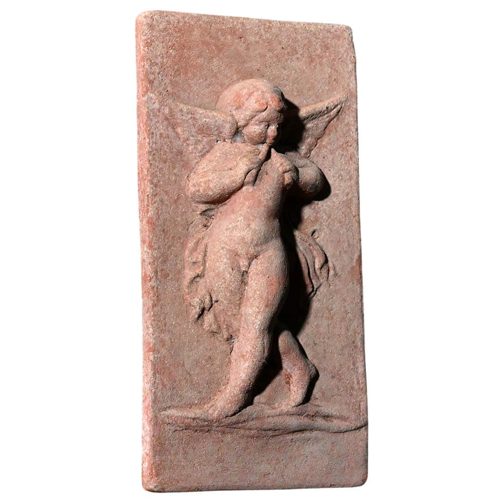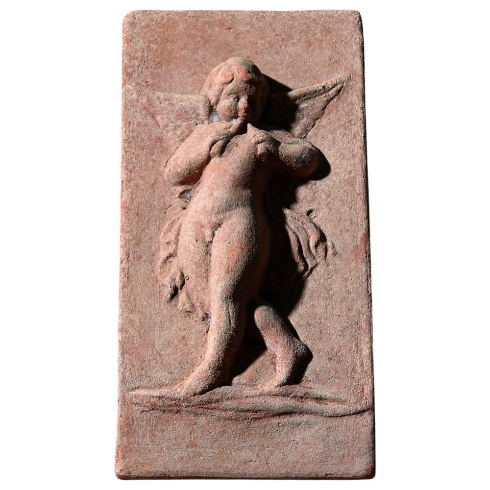 The detail of the flutes held near the chest introduces a strong symbolic reference to celestial music and harmony. The natural terracotta surface, with its warm tones and subtle handcrafted patina, enhances the authenticity of the piece, making it ideal as a decorative terracotta wall panel for classical and timeless interiors.