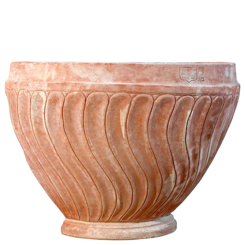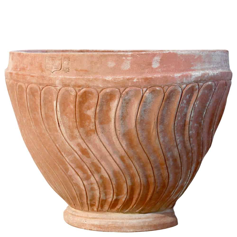 The Spiral-columned wall pot in terracotta is a wall-mounted planter designed to be placed on walls, niches, ledges, or architectural surfaces. Its elegant shape and decorative craftsmanship reflect traditional Tuscan artistry, with a strong connection to Impruneta terracotta heritage.