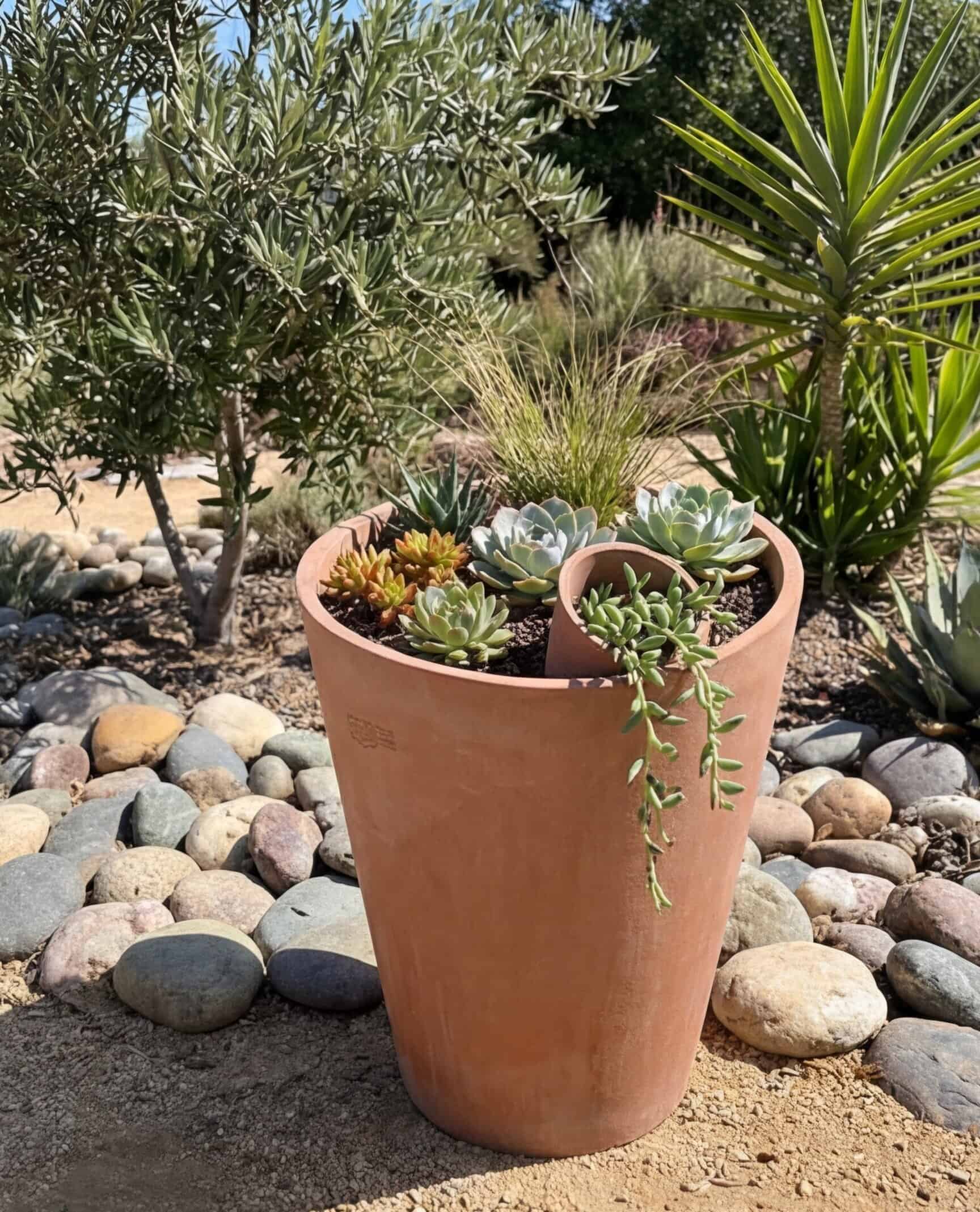 Nei progetti di xeriscaping, dove il risparmio idrico è parte integrante della progettazione, scegliere un vaso che collabora con la pianta è una decisione concreta.