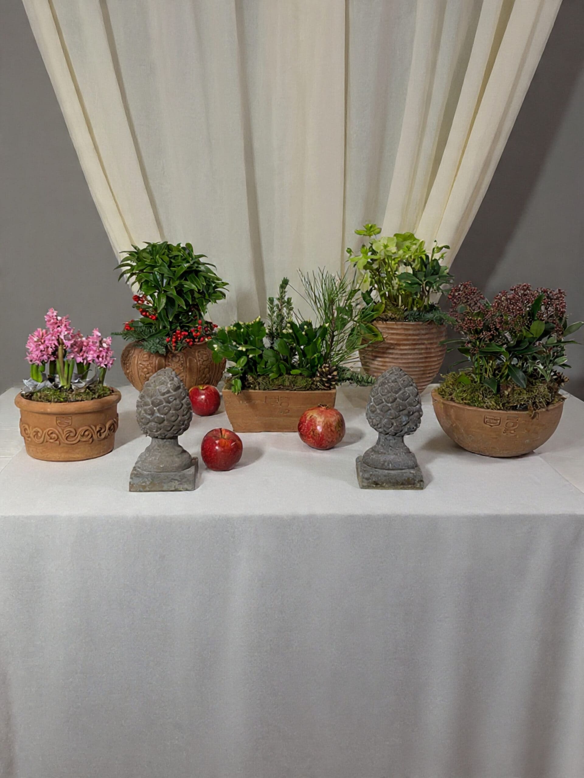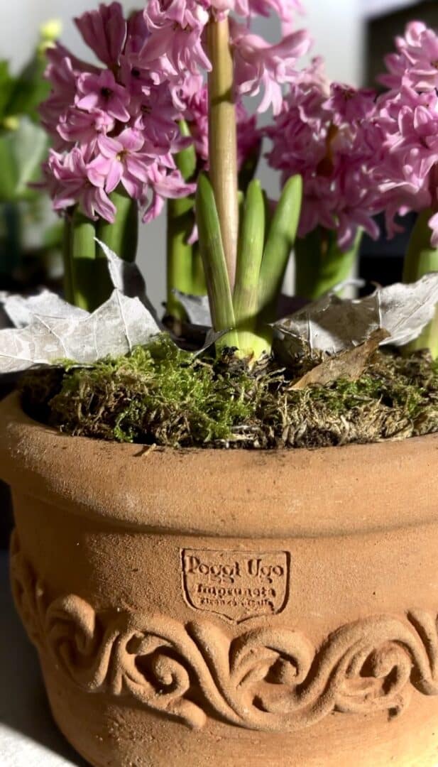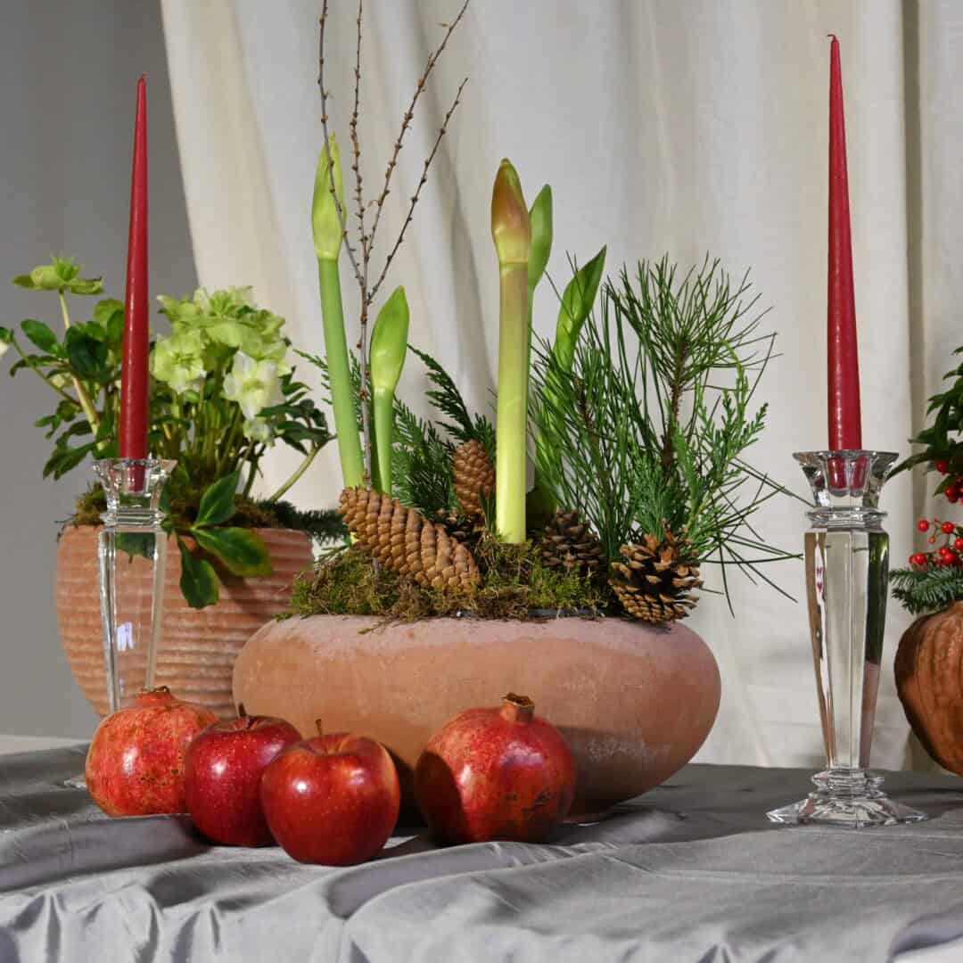 Giacinti, amarillys, ellebori e bacche dialogano con forme diverse, una alla volta, fino a creare una visione d’insieme che racconta come la terracotta possa vivere perfettamente anche negli spazi indoor.