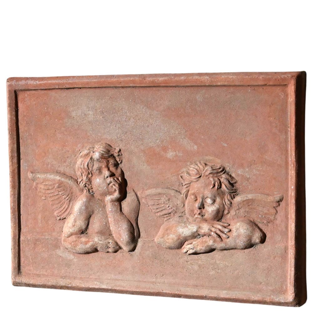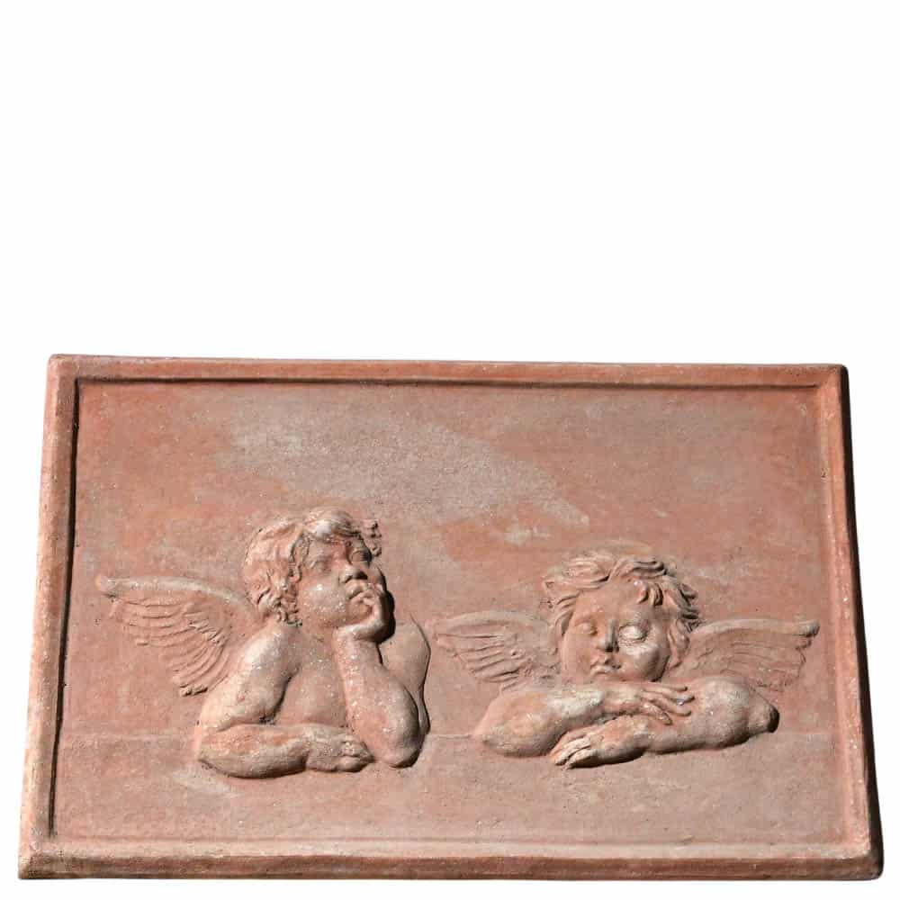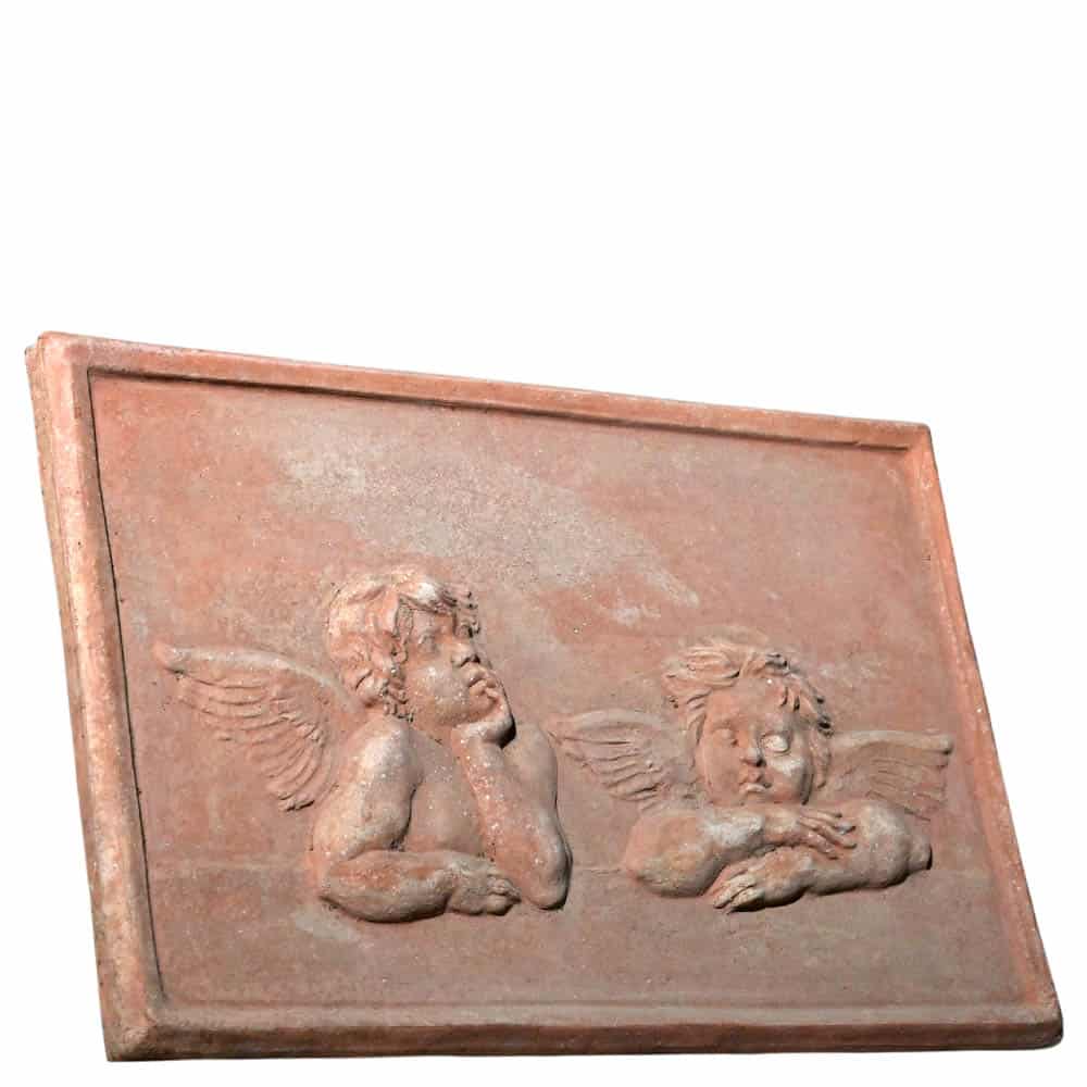 Il pannello Angeli Raffaello in terracotta e un rilievo rettangolare ispirato ai celebri putti della Madonna Sistina di Raffaello Sanzio. La scena traduce un’iconografia classica in un linguaggio scultoreo, trasformando il dipinto originale in un pannello in terracotta decorativo con forte valore artistico.