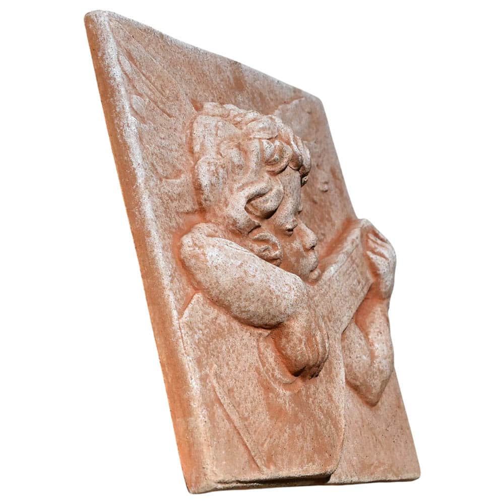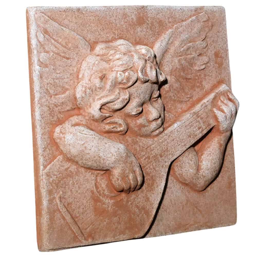 Realizzato in terracotta naturale, il pannello decorativo garantisce solidita materica e durata nel tempo. La superficie in cotto valorizza i volumi del rilievo, creando effetti naturali di luce e ombra che esaltano la figura dell’angelo musicante.