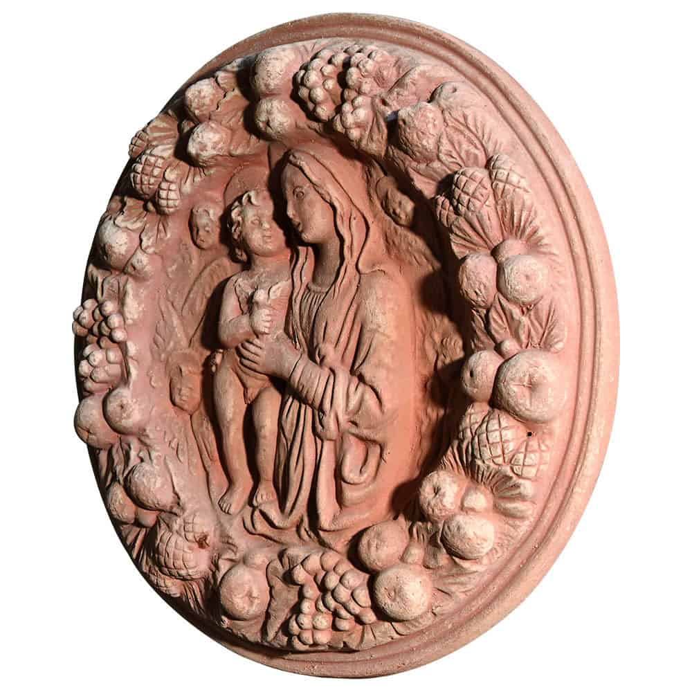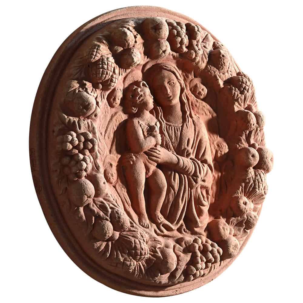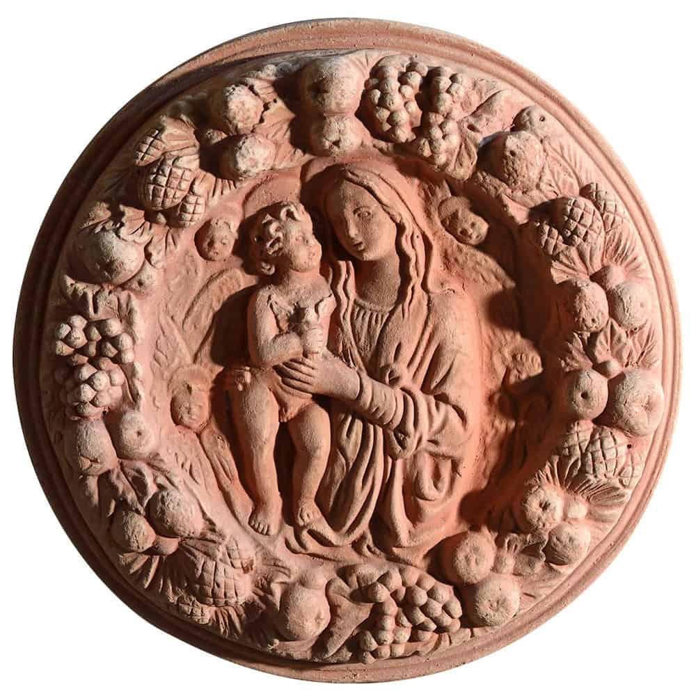Il tondo Vergine e Figlio in Ghirlanda, della Collezione Giubileo, è un’opera in terracotta che ripropone una tradizione artistica fiorentina. Il pannello realizzato in forma rotonda è pensato per essere appeso e presenta una composizione a doppio cerchio: nel primo, la Madonna seduta con il Bambino in piedi sulle sue ginocchia, e nel secondo, una ghirlanda di frutta, foglie e gigli che avvolge e incornicia la scena sacra.