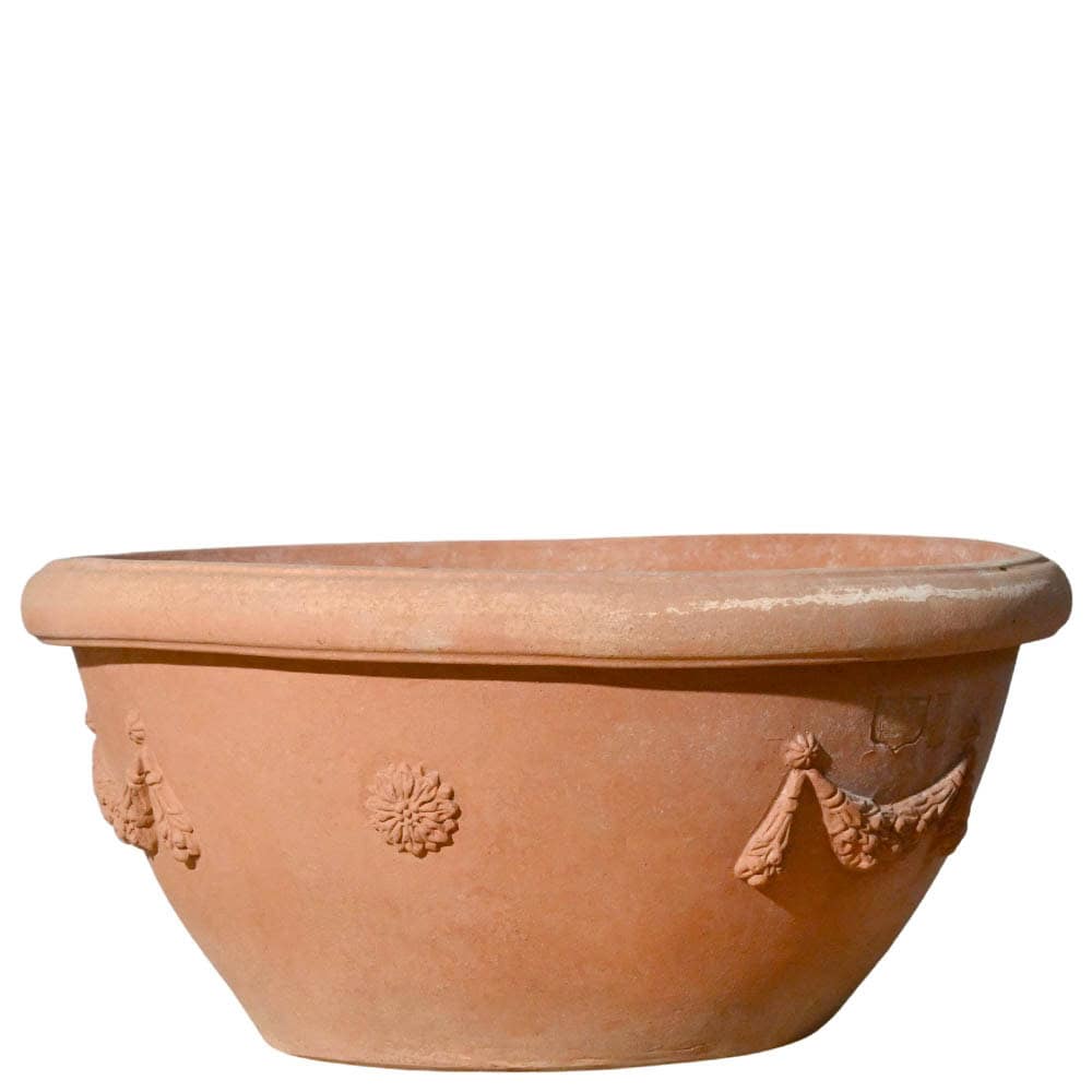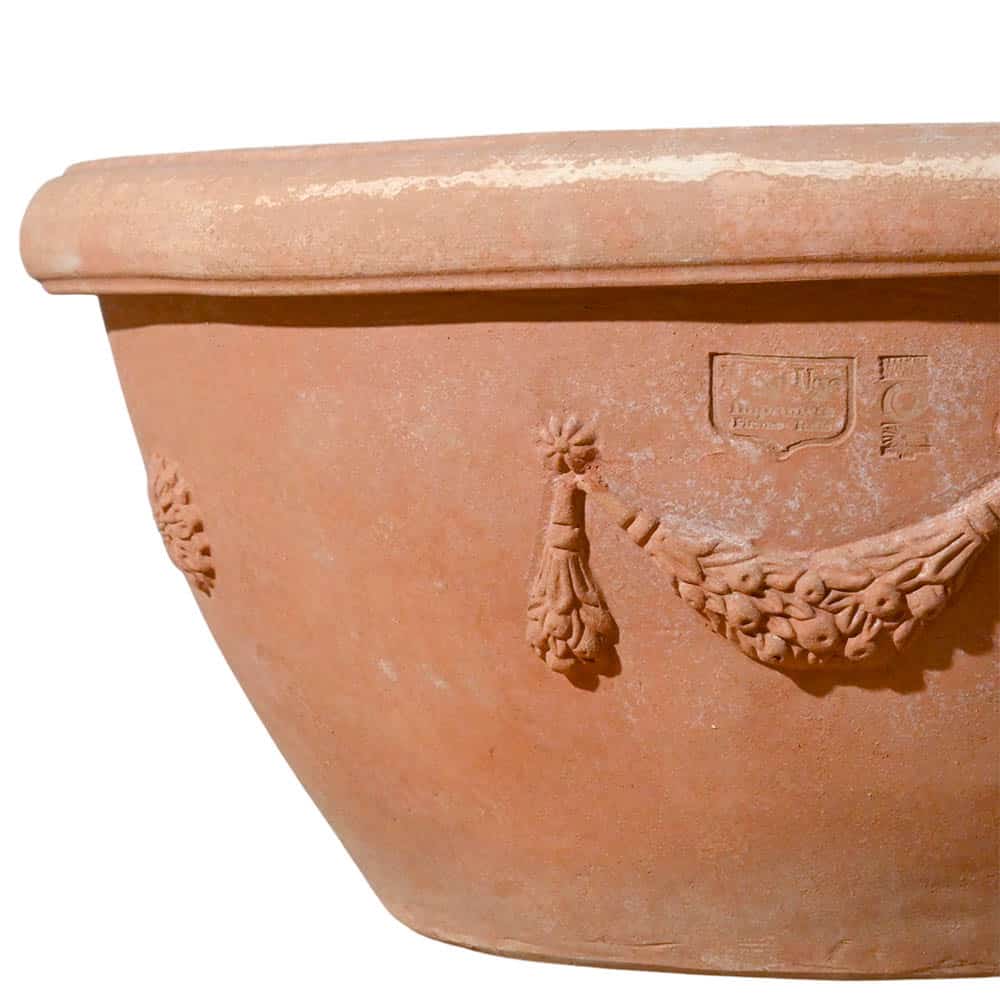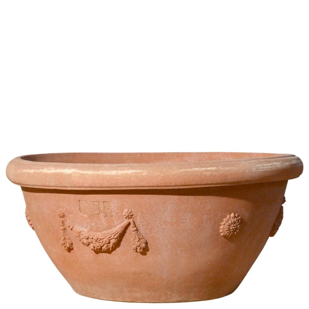 Il Catino a conca festonato è un vaso in terracotta di Impruneta dalla forma larga e poco profonda, caratterizzato da un profilo morbido e leggermente svasato verso l’alto. Il bordo superiore semplice e pulito contrasta con la ricca decorazione della fascia alta, creando un equilibrio armonioso tra semplicità e dettaglio ornamentale.
