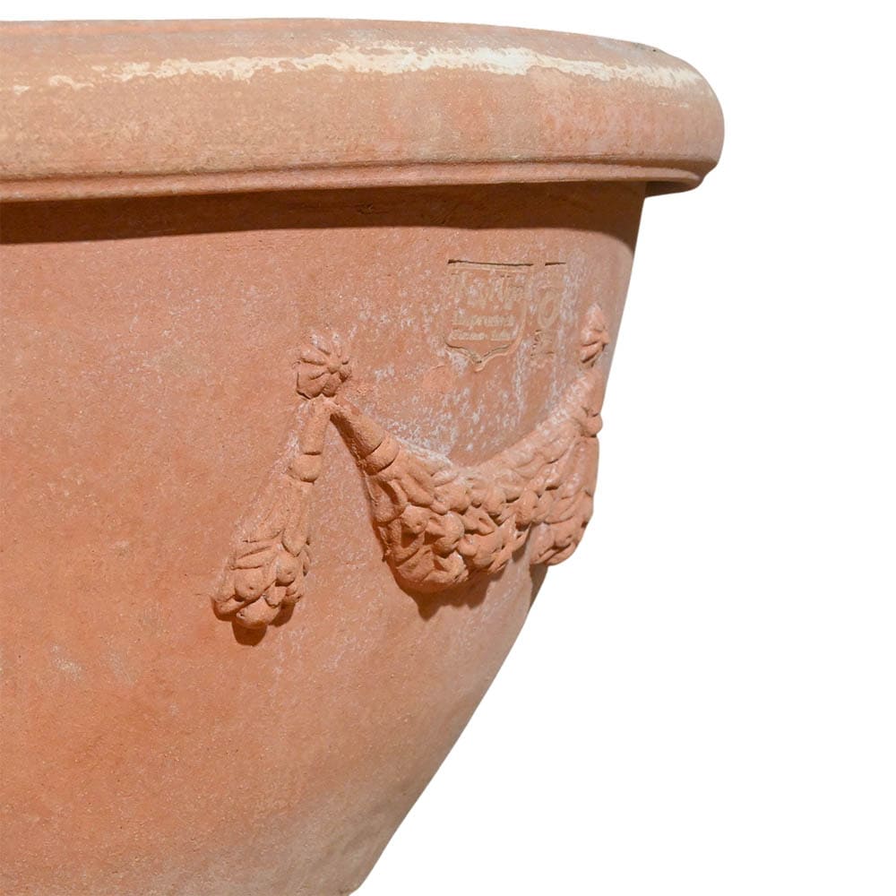 Il fregio a rilievo che corre lungo tutto il perimetro presenta motivi floreali stilizzati, ghirlande intrecciate e piccoli elementi vegetali, richiamando l’estetica classica dei manufatti toscani. La parte inferiore liscia mette in risalto la lavorazione artigianale e la qualità della terracotta, tipica della tradizione di Impruneta.