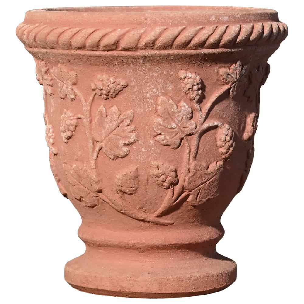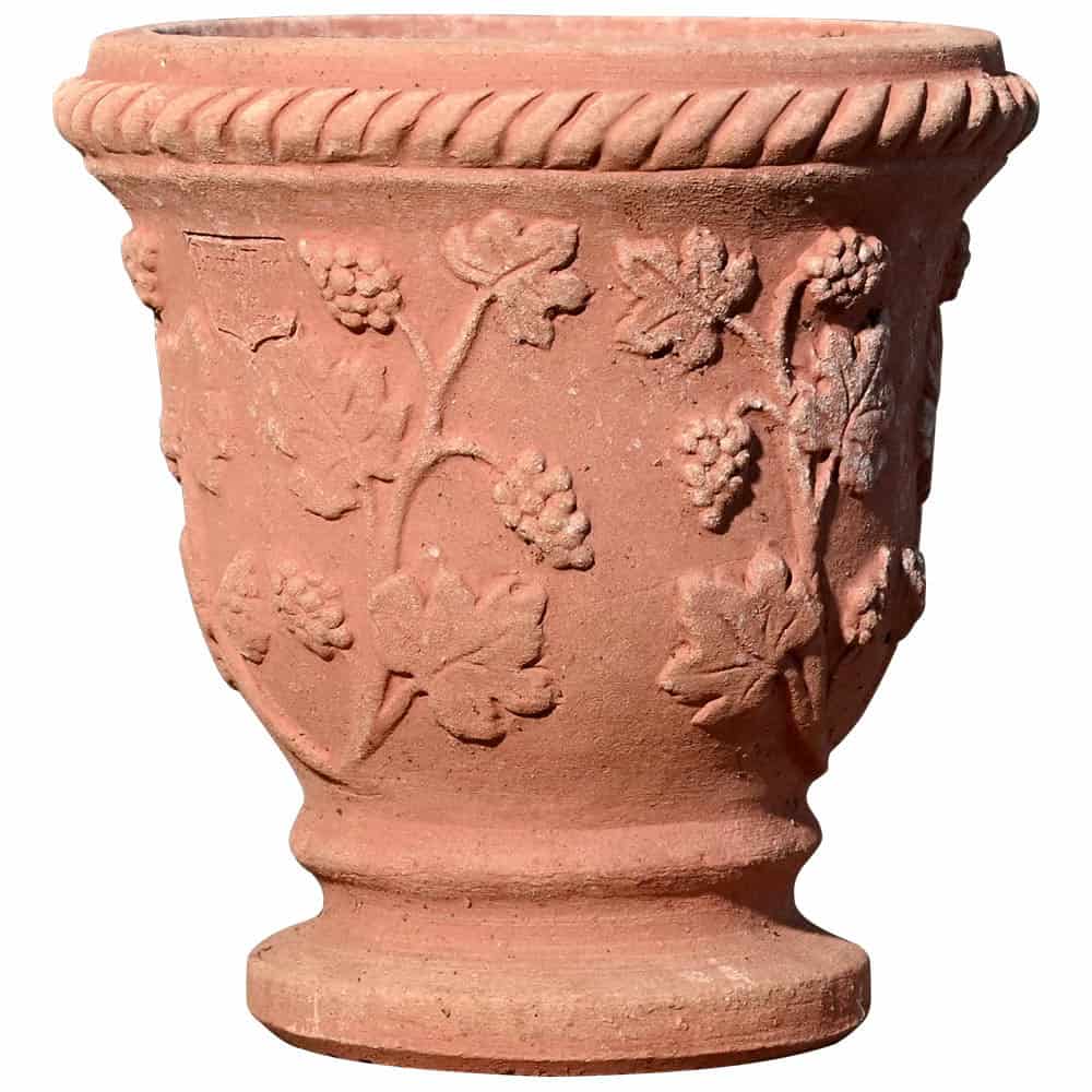 Il Vasetto decorato con uva è un piccolo vaso in terracotta di Impruneta, realizzato a mano con grande cura. La forma a coppa conferisce al vaso un profilo armonioso e proporzionato, valorizzando sia le piante che l’impatto decorativo dell’oggetto. La parte superiore e il corpo del vaso sono arricchiti da eleganti decorazioni a rilievo raffiguranti grappoli d’uva, tralci e foglie, che ne enfatizzano il carattere ornamentale.